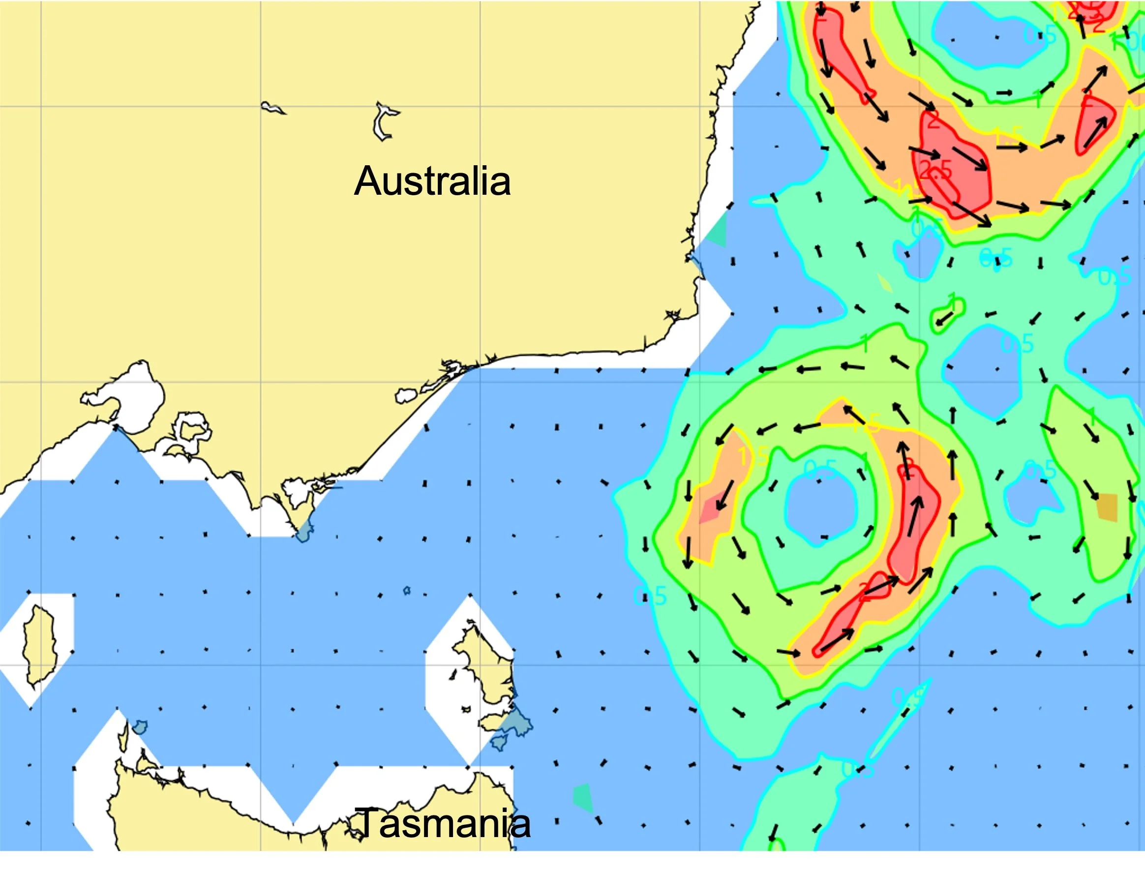 For example, an eddy positioned directly on the rhumb line can significantly influence routing decisions. Identifying such features in advance allows the navigator to either exploit favorable currents or avoid adverse ones. Similarly, eddies are frequently encountered in the Sydney Hobart race and are a key navigation element of this race.